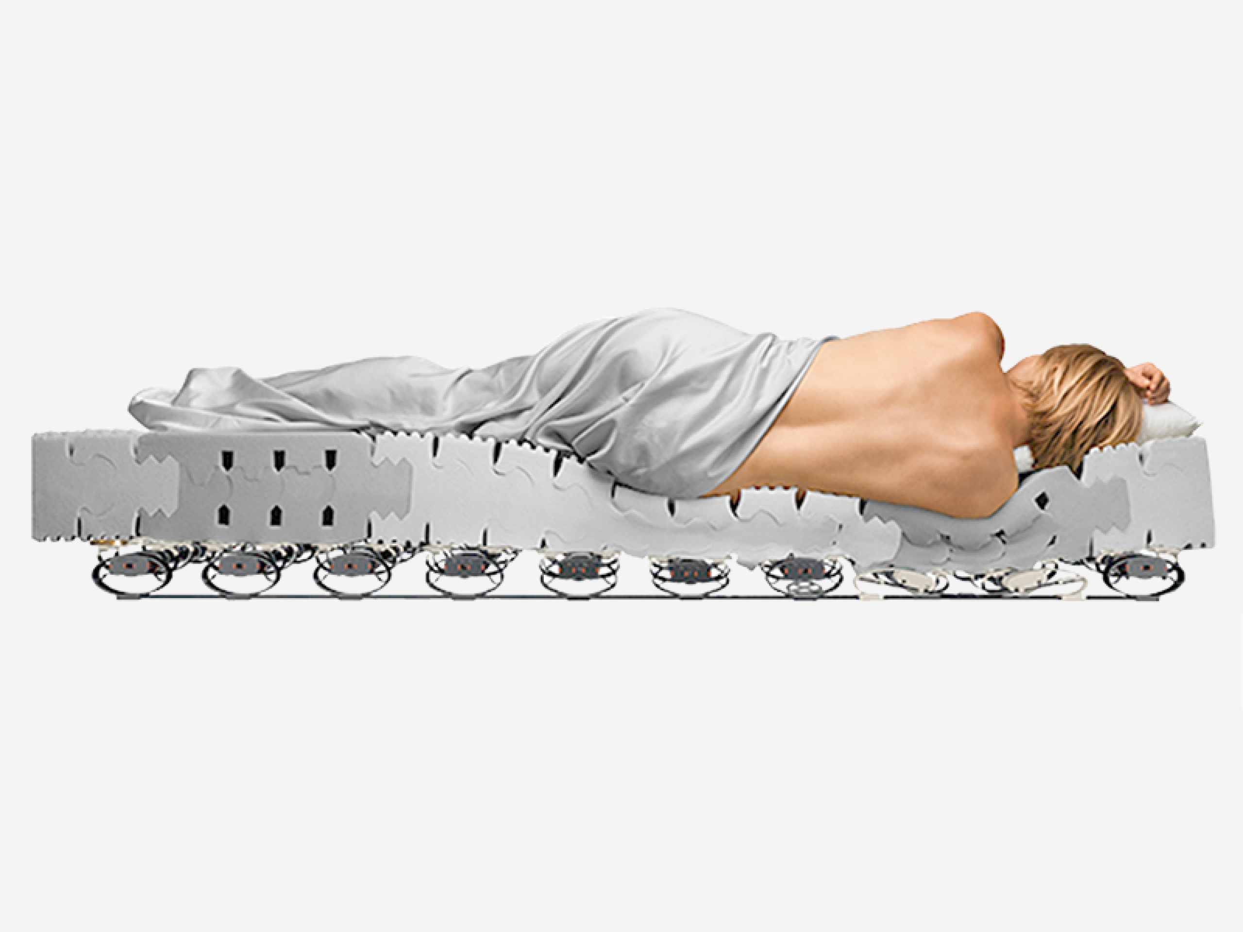 Skulderzonen i en Lattoflex sengebund er helt unik og patenteret, den består af 2 tvær lameller, der hænger i en eftergivende og dermed fjedrende gummibånd. SKulderen kan synke ned i materialet når du ligger på siden, giver en lige rygstilling og dermed aflastning af nakke og lænd.